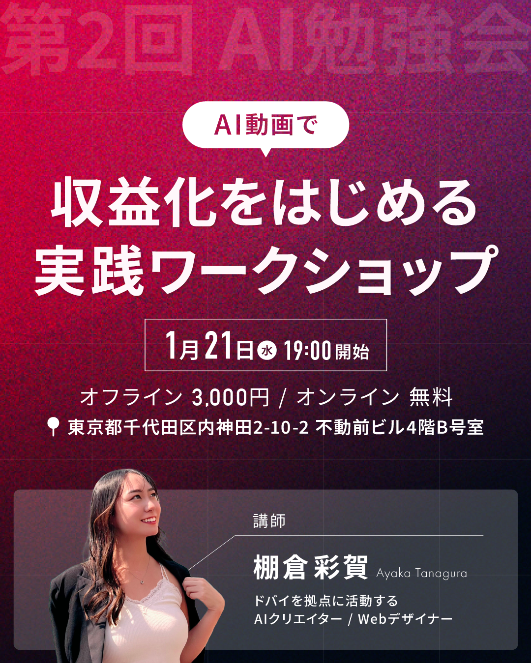 2026年1月21日(水)19時に東京都内にて、ドバイを拠点に活動するAIクリエイター棚倉 彩賀氏を講師にお招きし、AI勉強会を開催いたします。